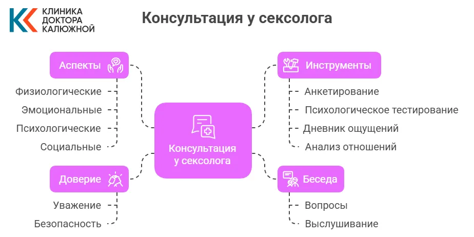 Есть мнение, что сексолог задаёт неудобные вопросы или оценивает — это не так. Основная задача специалиста — закрепить ощущение безопасности, чтобы человек мог открыто говорить о сокровенном. Важно подчеркнуть, что в процессе обсуждаются не только физиологические аспекты, но и эмоциональные, психологические, социальные нюансы, влияющие на интимную жизнь.